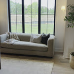 The Gidget Sheepskin Camel Sofa is a stylish and comfortable addition to any home. The bench-seat cushioning and feather-blend seating ensure total comfort for lounging and relaxing. This piece can be paired with a variety of home decor styles, from modern coastal to traditional. Perfectly complemented by white plaster lighting and a Turkish oushak rug. Ideal for Nashville, Florida, and Utah home designs.