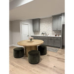 Upholstered in a deep olive velvet and paired with a rich brown base, this rounded ottoman can be placed just about anywhere. Light, versatile color can move between spaces and style with ease.