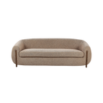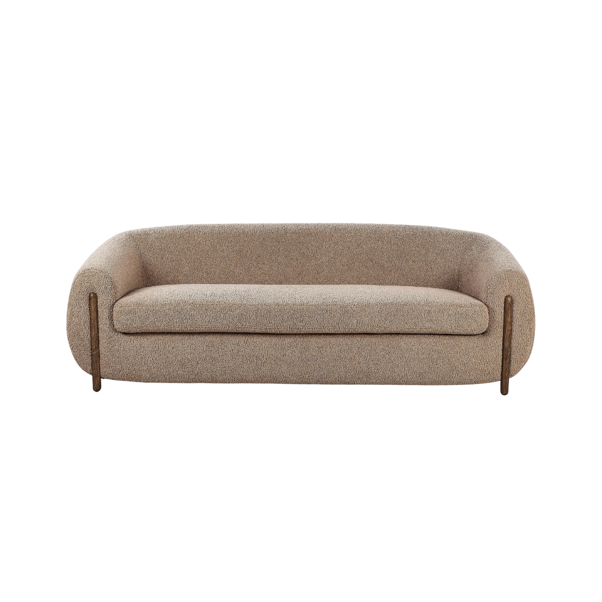 Lyla Sheepskin Camel Sofa is a fresh, elongated take on the traditional tub chair, with exaggerated depth for drama and comfort. Solid wood legs intersect sheepskin upholstery on this plush sofa for clean contrast and scale.