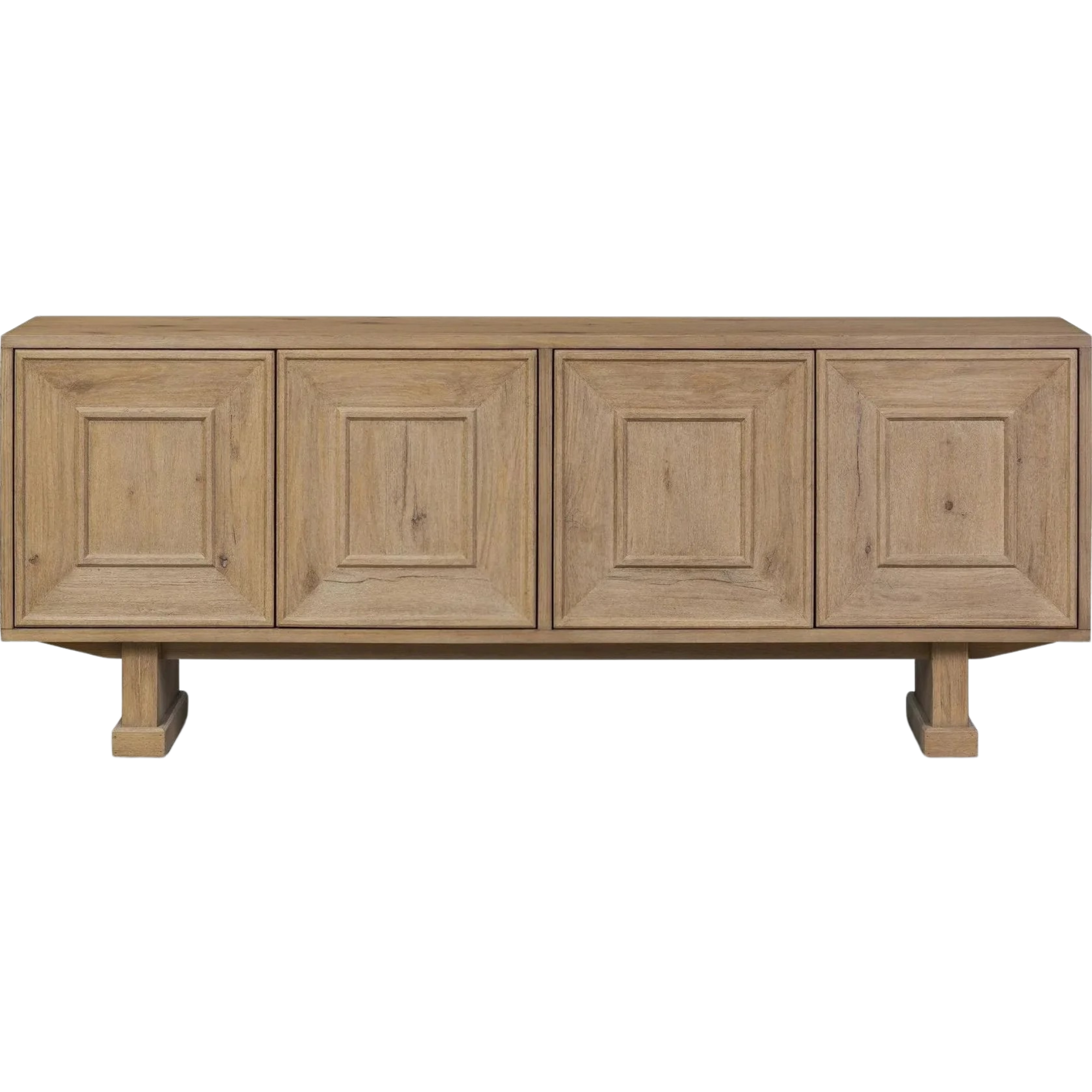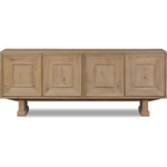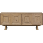 Store favorite dinnerware, table linens and more in this modernized Deco sideboard, with inverted chamfered framing and molding around the doors. Made from solid oak with a light, drifted finish and ski-style legs that elevate the whole piece.