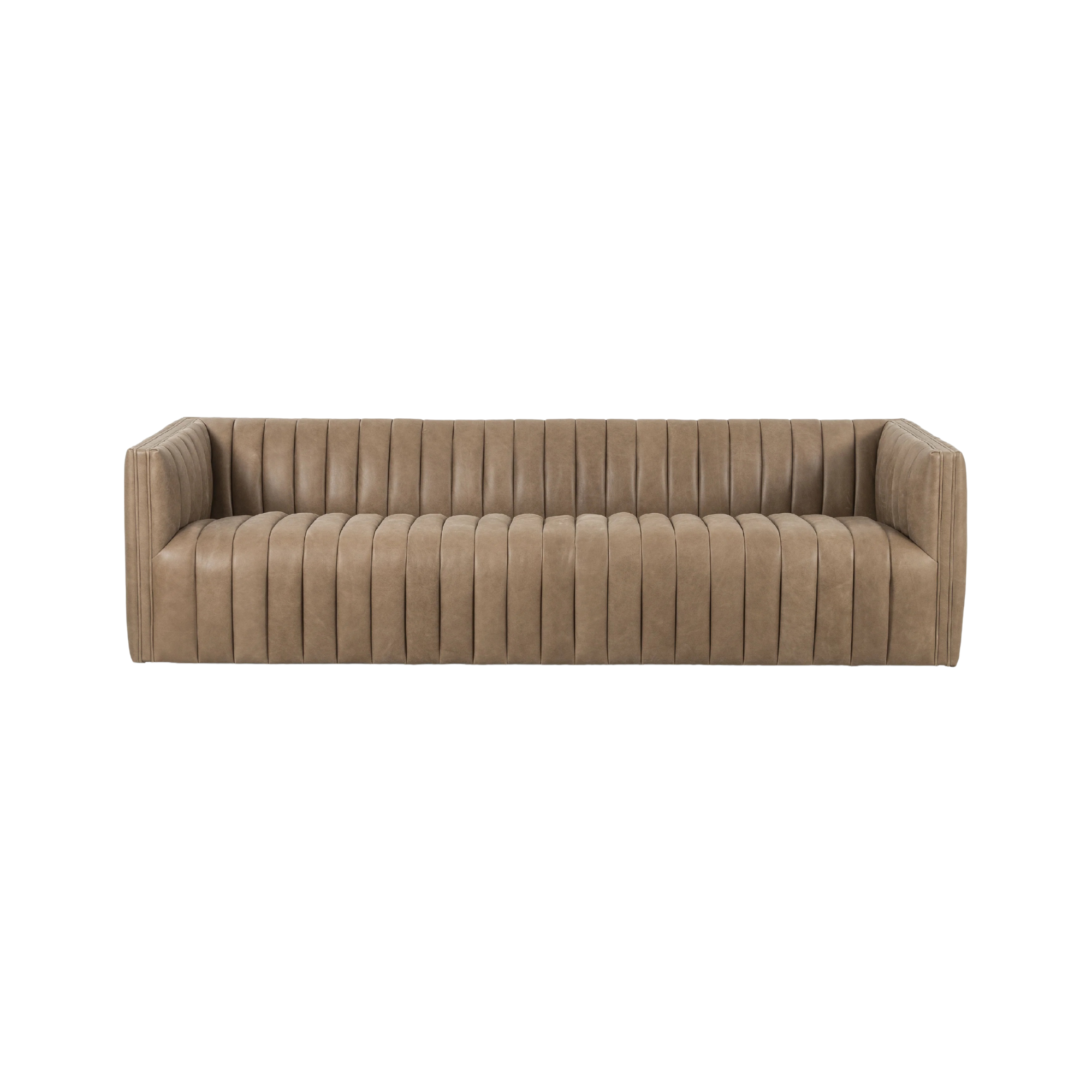 Featuring Augustine 97" Sofa - Palermo Drift by Four Hands at Amethyst Home. This Augustine 97" Sofa - Palermo Drift features dramatically channeled upholstered in taupe top-grain leather. We love the crisp, clean look and sumptuous sit this offers to a space!