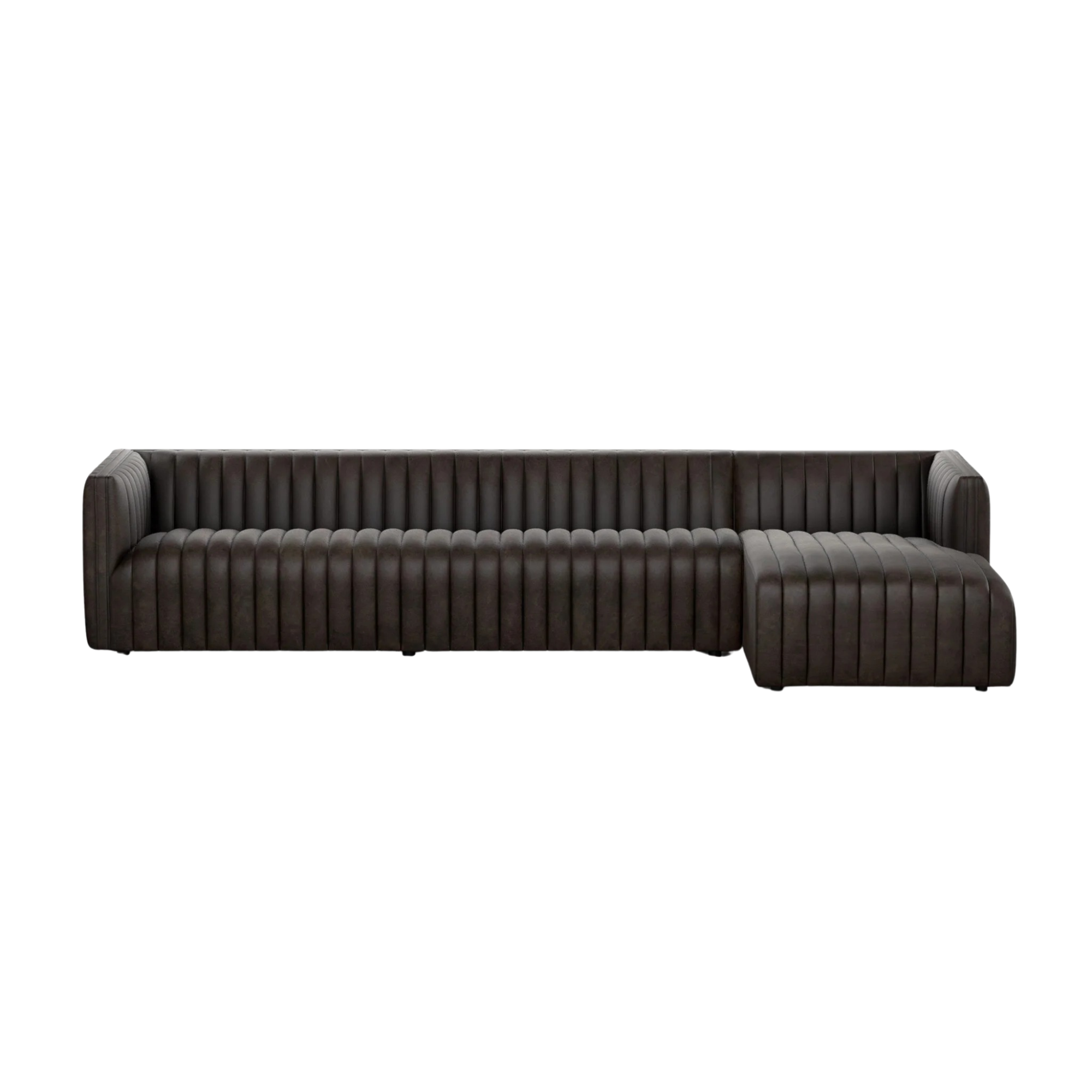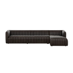 A dramatically channeled sofa wrapped in a dark top-grain leather creates a mature, clean look inspired by modern menswear. Two-piece sectional with right arm-facing chaise, perfectly sized for smaller spaces.