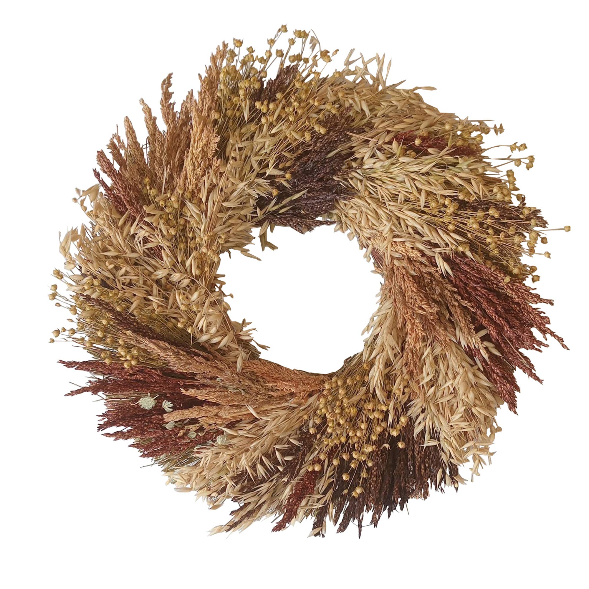 A lush harvest wreath that can both transition in and out of the holiday with its abundant grains, this wreath is made on a twig base with gorgeous avena, flax, and assorted grains to fill the wreath out.