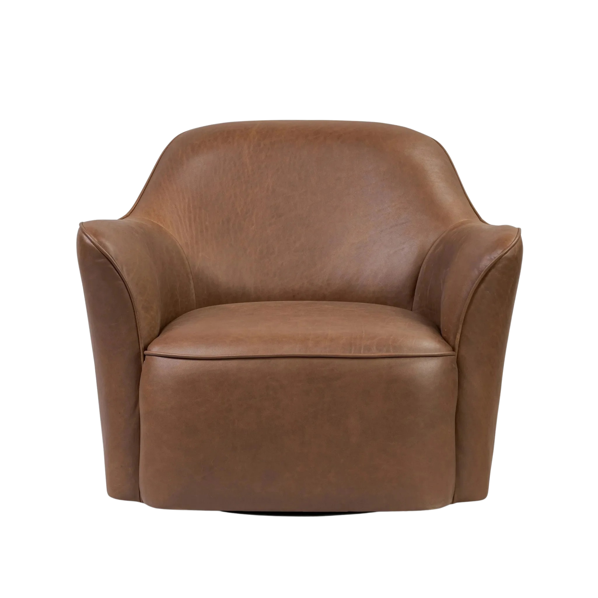 Smooth lines and impeccable tailoring bring a clean, elevated look to this modernized 360 swivel chair. Made from top-grain leather with a rich mahogany finish, flared arms and piping trim reflect the intention behind this timeless design.