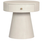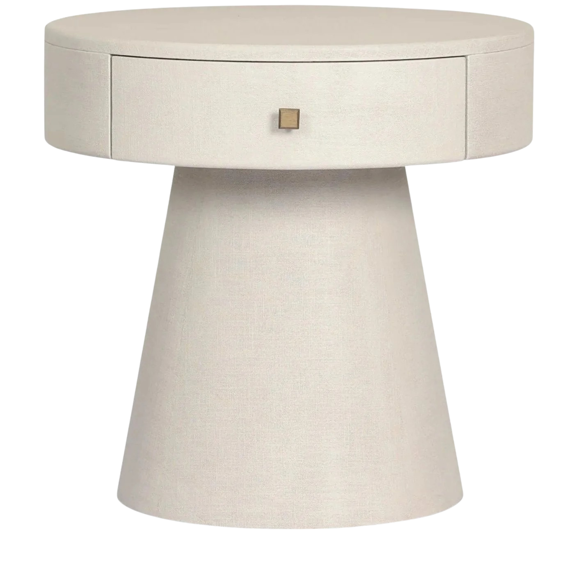 Wrapped in ivory painted linen, a rounded nightstand features a single drawer and tapered pedestal base, bringing crisp texture plus storage to the bedside.