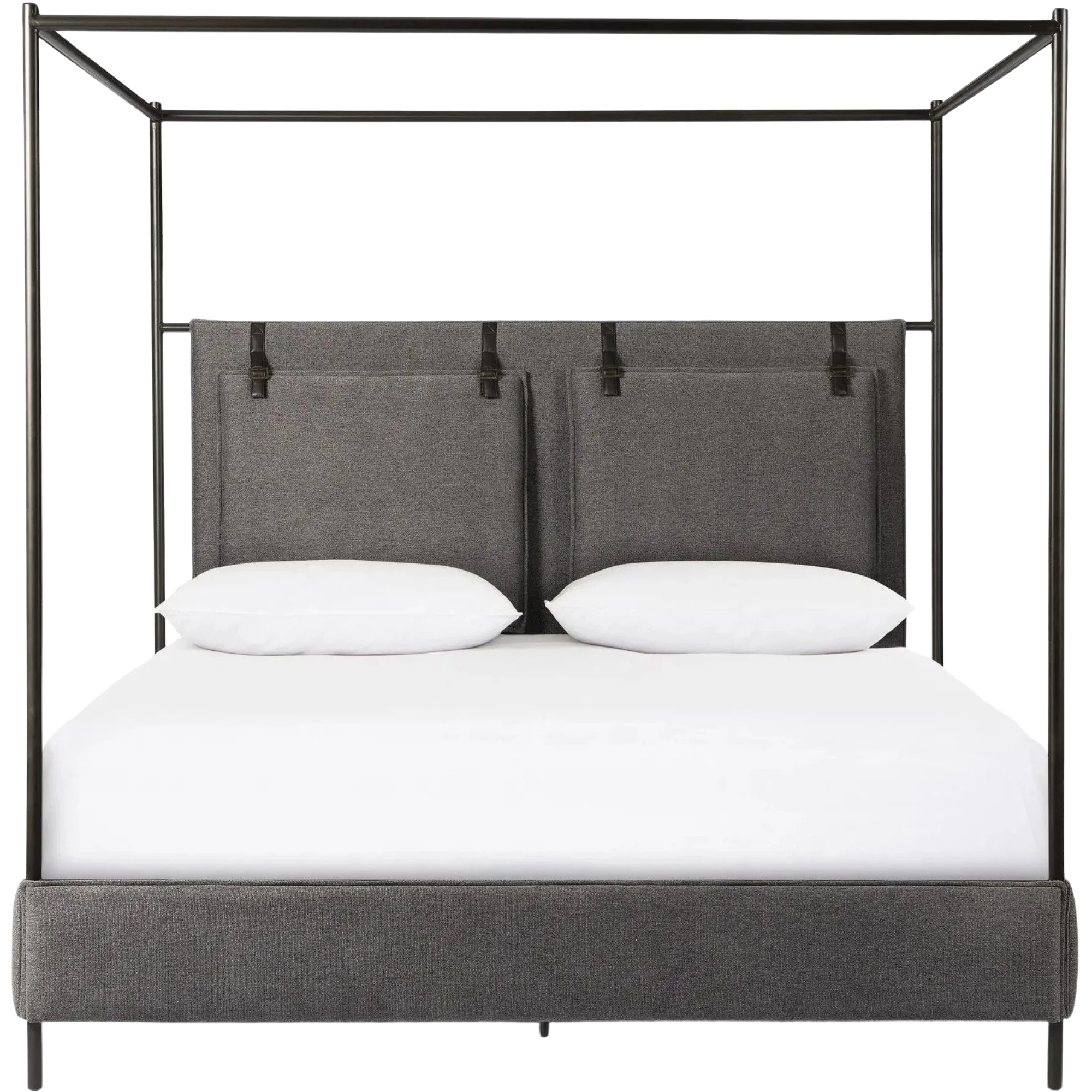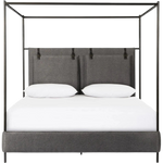 Featuring Leigh San Remo Ash Canopy Bed by Four Hands at Amethyst Home. Safari styling gets refreshed with ash grey fabric and leather straps that secure decorative suspended headboard pillows. Box spring required. This bed is not compatible with an adjustable mattress.KingOverall Dimensions: 80.75"w x 84.75"d x 82.25"hWeight: 212.74 lbsQueenOverall Dimensions:. Amethyst Home provides interior design, new home construction design consulting, vintage area rugs, and lighting in the Tampa metro area.