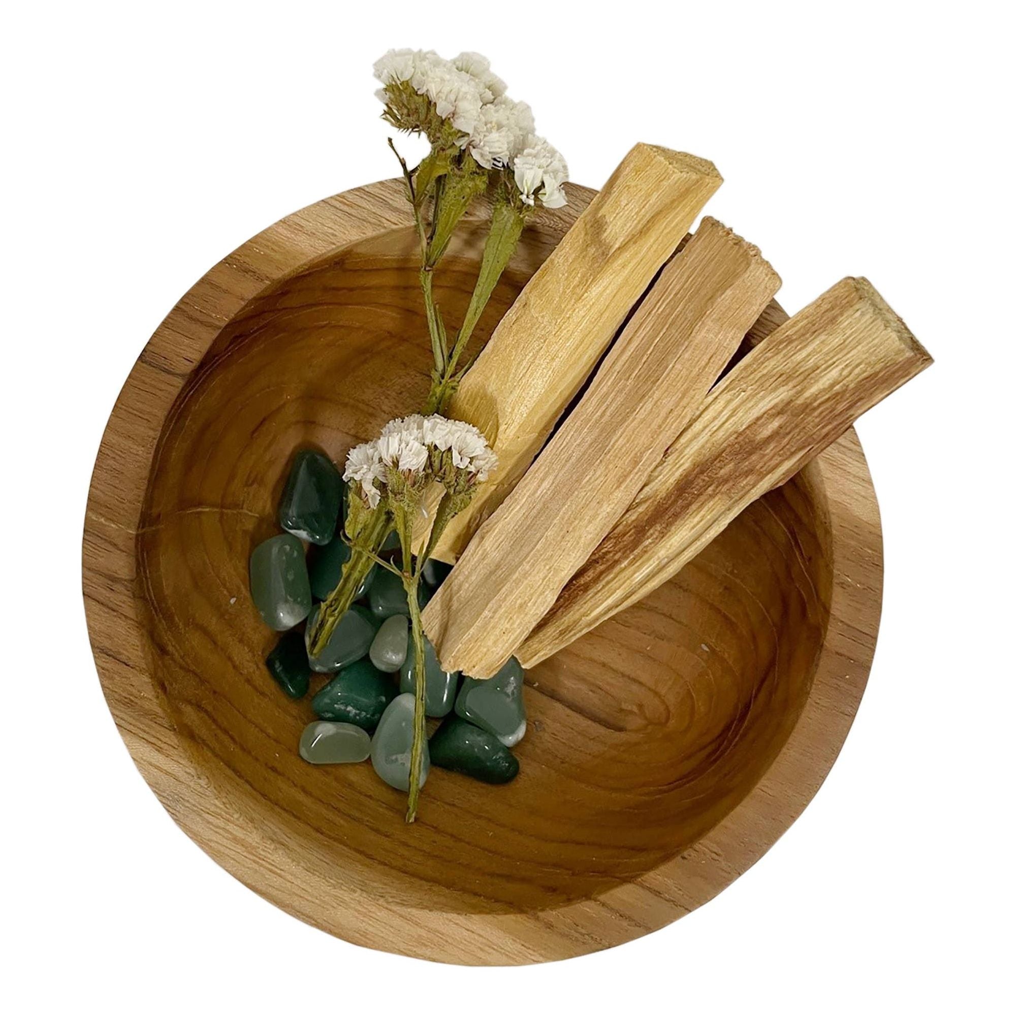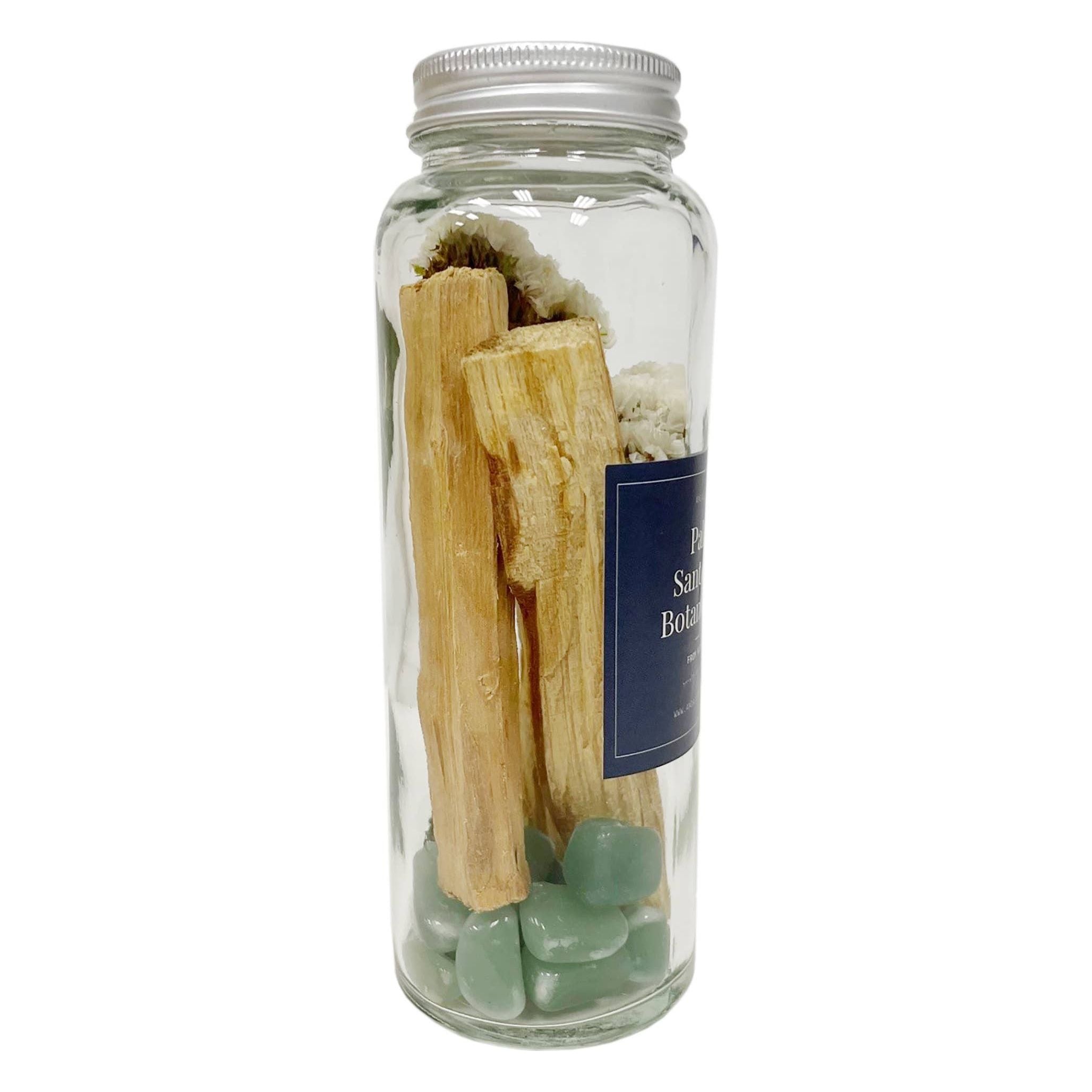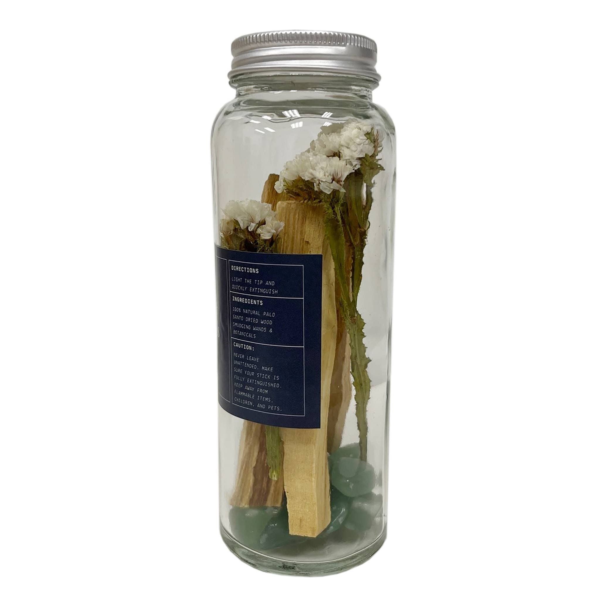 Our Palo Santo & White Flower Smudging Jar Set contains palo santo harvested in Peru, and delicate dried statice flower. We made this smudge kit to be both beautiful, simple and straight forward when you want to cleanse the energy of your spaces and including green quartz rocks in the base of the jar.