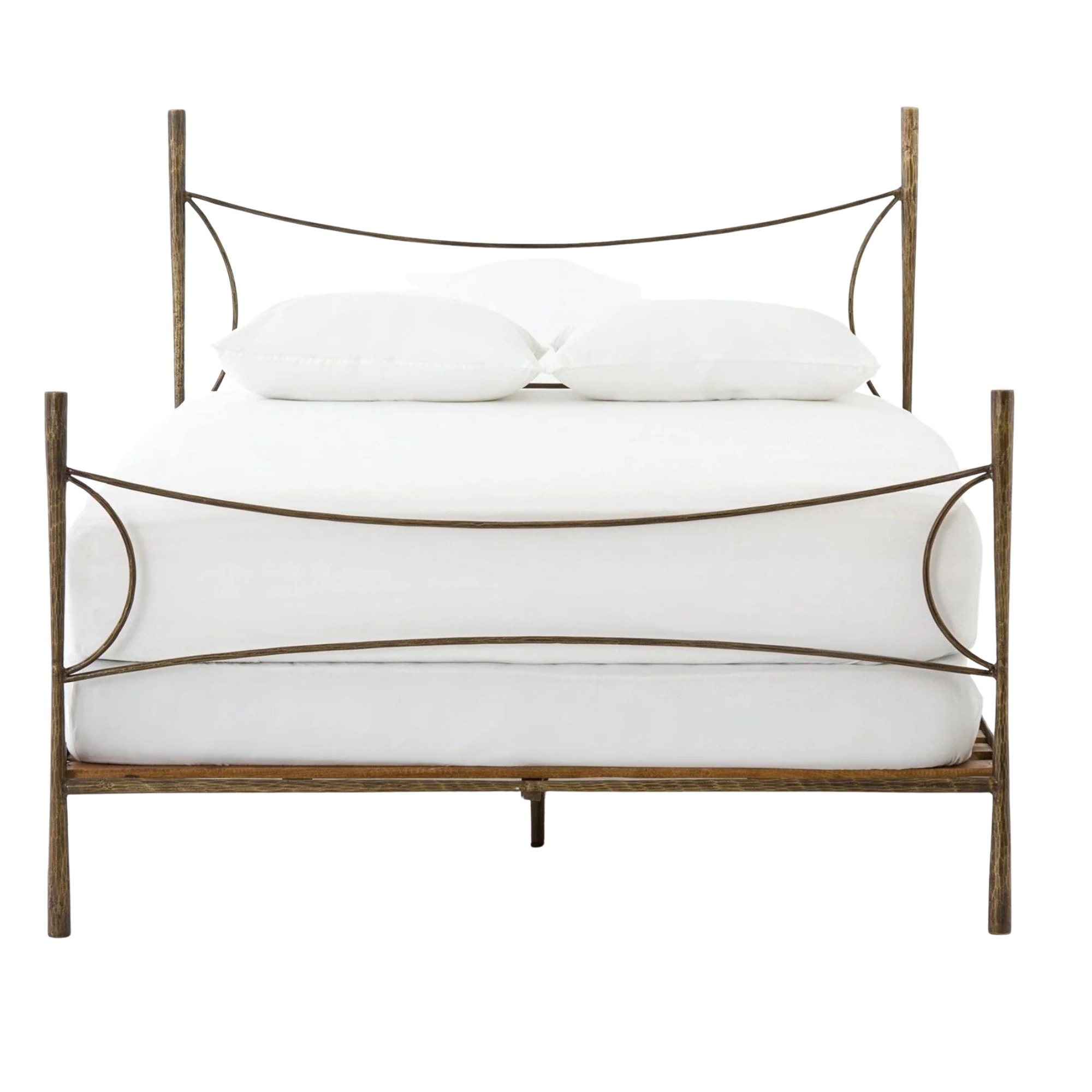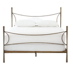 Beguiling curves soften hard materials for marked drama with this Westwood Bed. Slim, hammered iron is finished in antique brass for depth that defies this frame's feminine air. Low-profile box spring recommended.