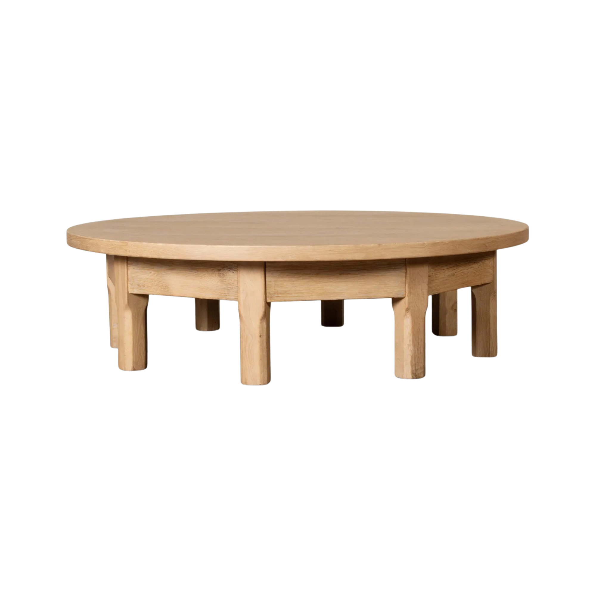 Made from bleached oak, a unique eight-leg base supports a rounded tabletop. Inspired by a "found object" aesthetic, this piece works a nomadic vibe into any room.