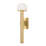 Intriguing shapes and mixed materiality define the captivating silhouette of Bellvale. With a torch-like appearance, the vertical stem of this sconce meets an illuminated alabaster dome with a knurled wedding band detail. The Aged Brass finish completes the vintage feel of Bellvale.