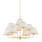 A vintage-inspired silhouette is elevated through thoughtful details in this transitional family. Arranged at varying heights, the overscale white linen tapered shades create a voluminous effect, like a sail billowing in the wind. Ivory trim provides subtle visual interest while remaining fresh and neutral. The frame is finished in Aged Brass with rounded right angles that keep the design feeling soft. Available as a sconce or chandelier in two sizes.