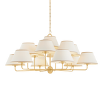 A vintage-inspired silhouette is elevated through thoughtful details in this transitional family. Arranged at varying heights, the overscale white linen tapered shades create a voluminous effect, like a sail billowing in the wind. Ivory trim provides subtle visual interest while remaining fresh and neutral. The frame is finished in Aged Brass with rounded right angles that keep the design feeling soft. Available as a sconce or chandelier in two sizes.