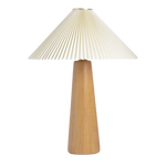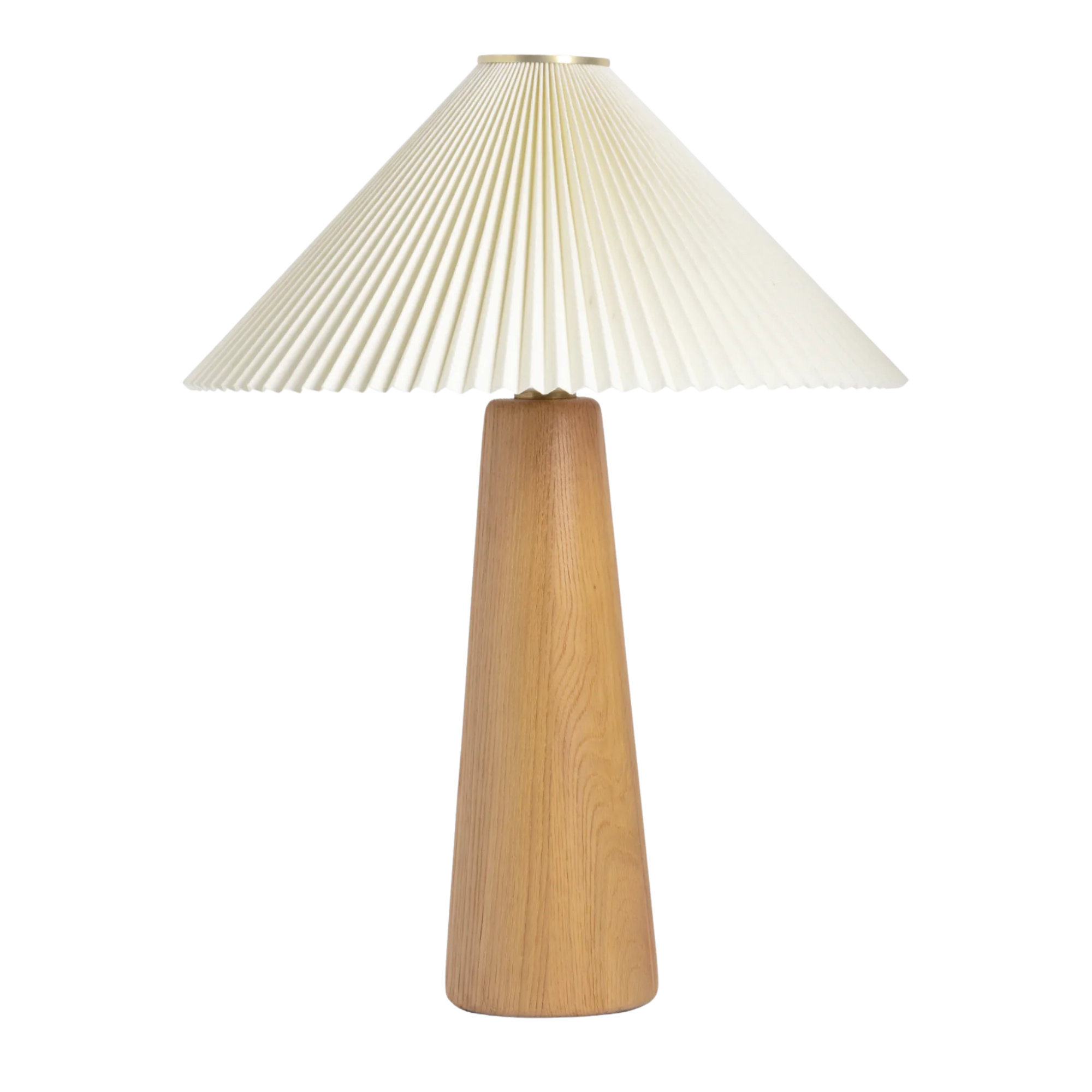 Le minimalisme moderne rencontre le traditionnel. Une base de lampe de table effilée en bois est surmontée d'un abat-jour plissé avant-gardiste.