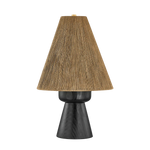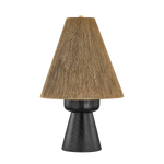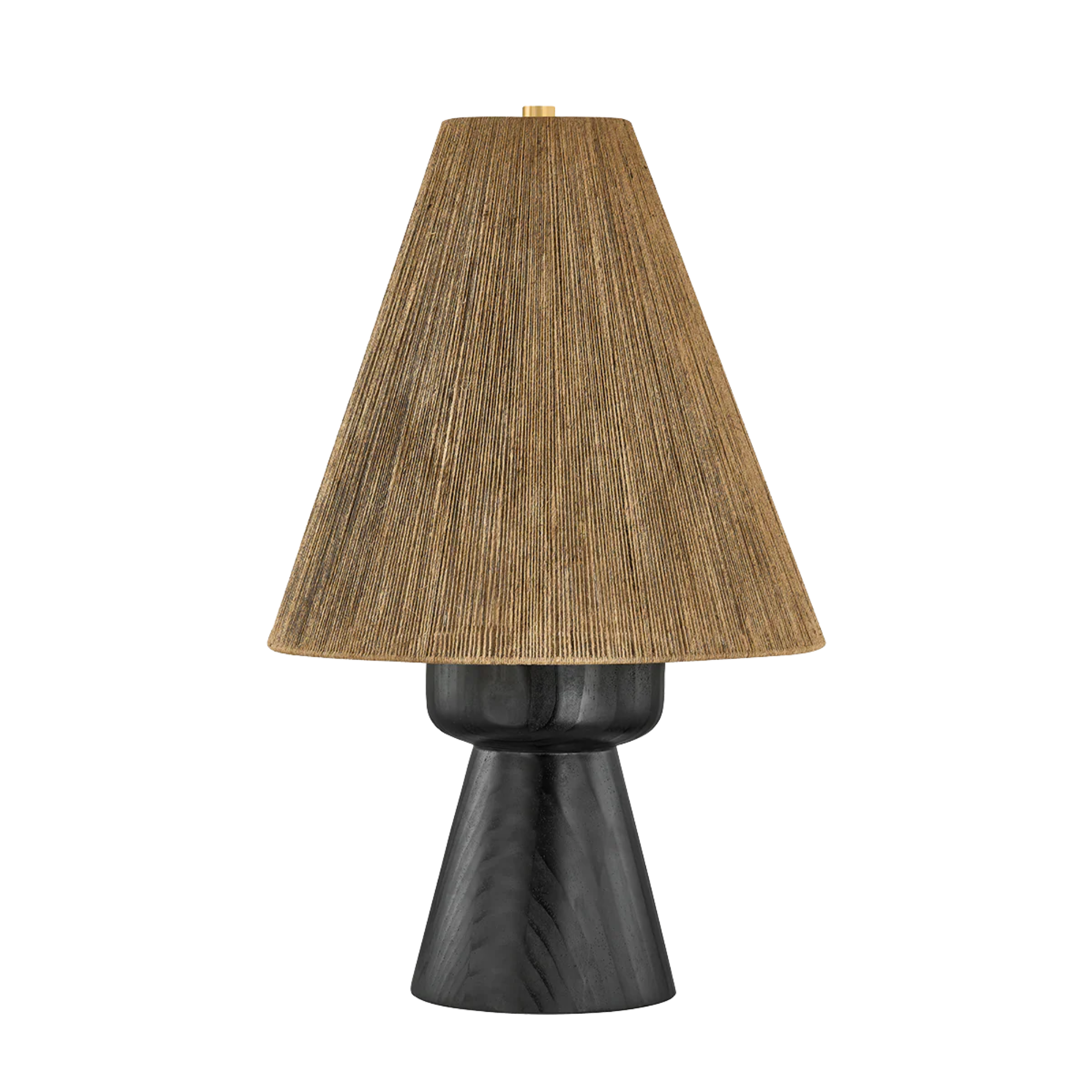 A unique approach to shading, clever play on proportions, and intriguing use of textures make the Mannsville table lamp a worthy conversation piece. Carved from Black Pine Wood, the tapered base gives the lamp a rich, organic aesthetic. This foundation contrasts beautifully with the jute string shade, creating an interplay of light and dark that is accented by an Aged Brass finish on the hardware. The oversized shade makes the base appear smaller, adding drama to desks and consoles.