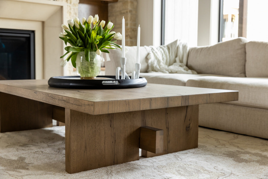 As lovers of luxe aesthetics at Amethyst, we love the nature inspired Isaac Rubbed Light Oak Coffee Table . This item pairs well with other brands such as Visual Comfort and is perfect for loft homes.