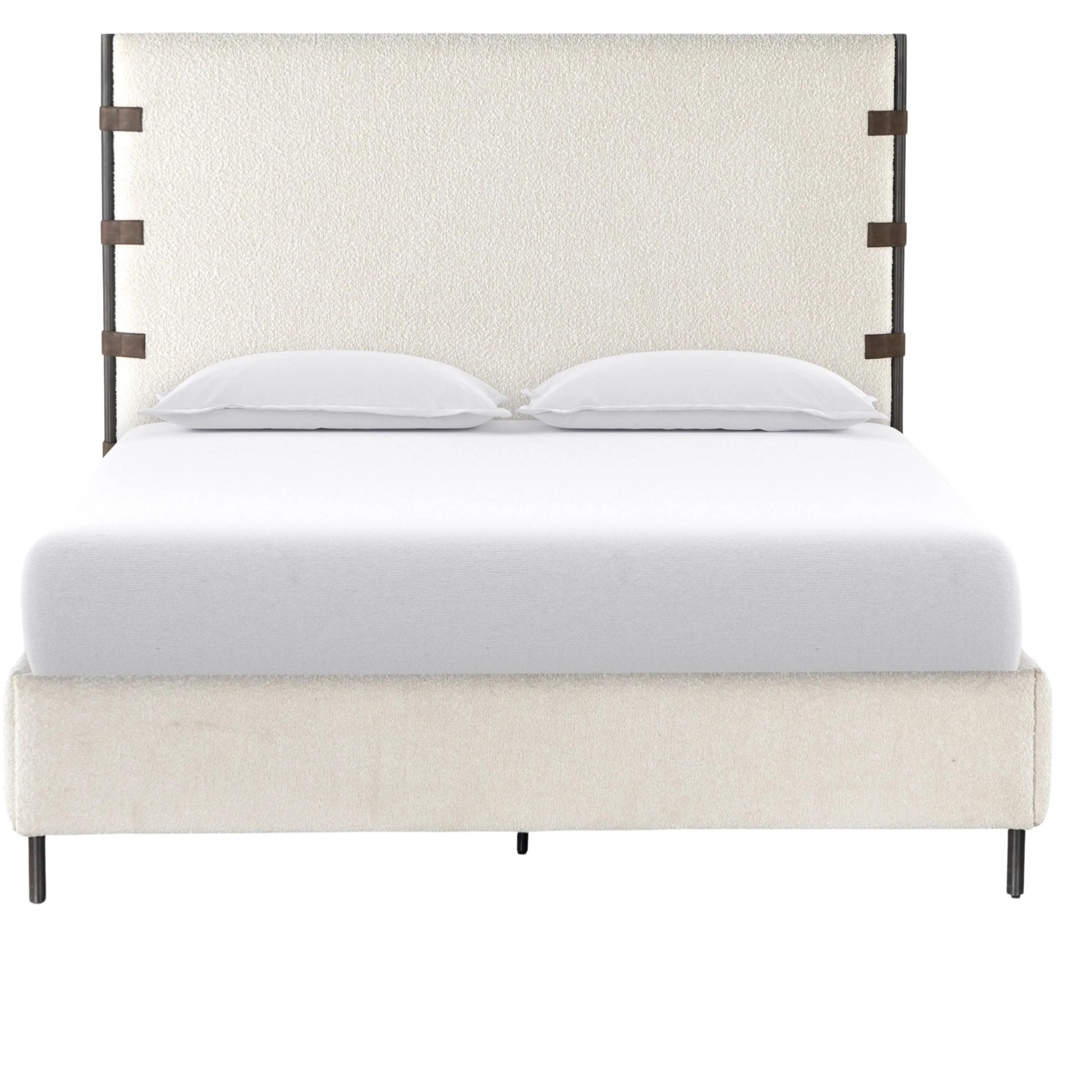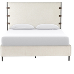 Featuring Anderson Knoll Natural Bed by Four Hands at Amethyst Home. Bring texture into play. Upholstered in a performance fabric in a classic cream-colored boucle for Knoll Natural with decorative leather straps adding a material-driven touch with contrast. Standard box spring required.
