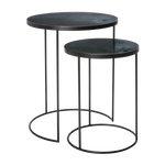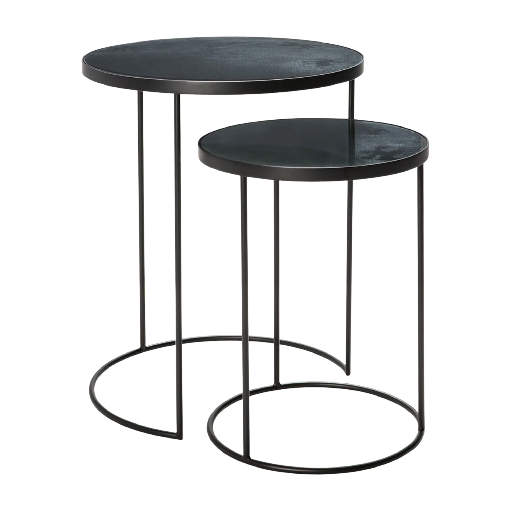 Featuring Nesting Side Table Set - Charcoal by Ethnicraft at Amethyst Home. Featuring a heavy aged mirror surface, this Charcoal Nesting Side Table Set brings a unique look to any space. Place beside the sofa, sitting next to your bed, or as a complementary piece to a work of art, its adaptability offers many possibilities.