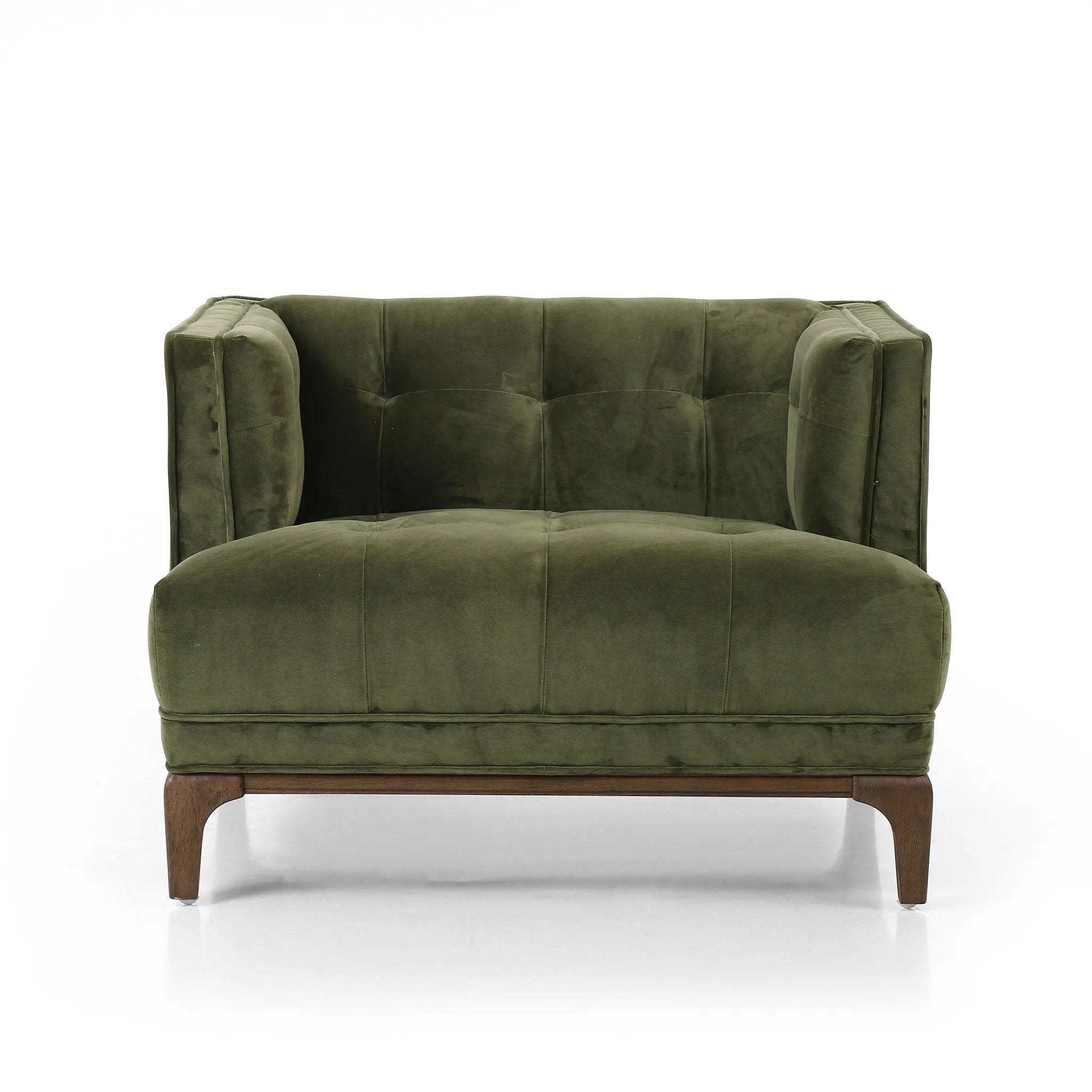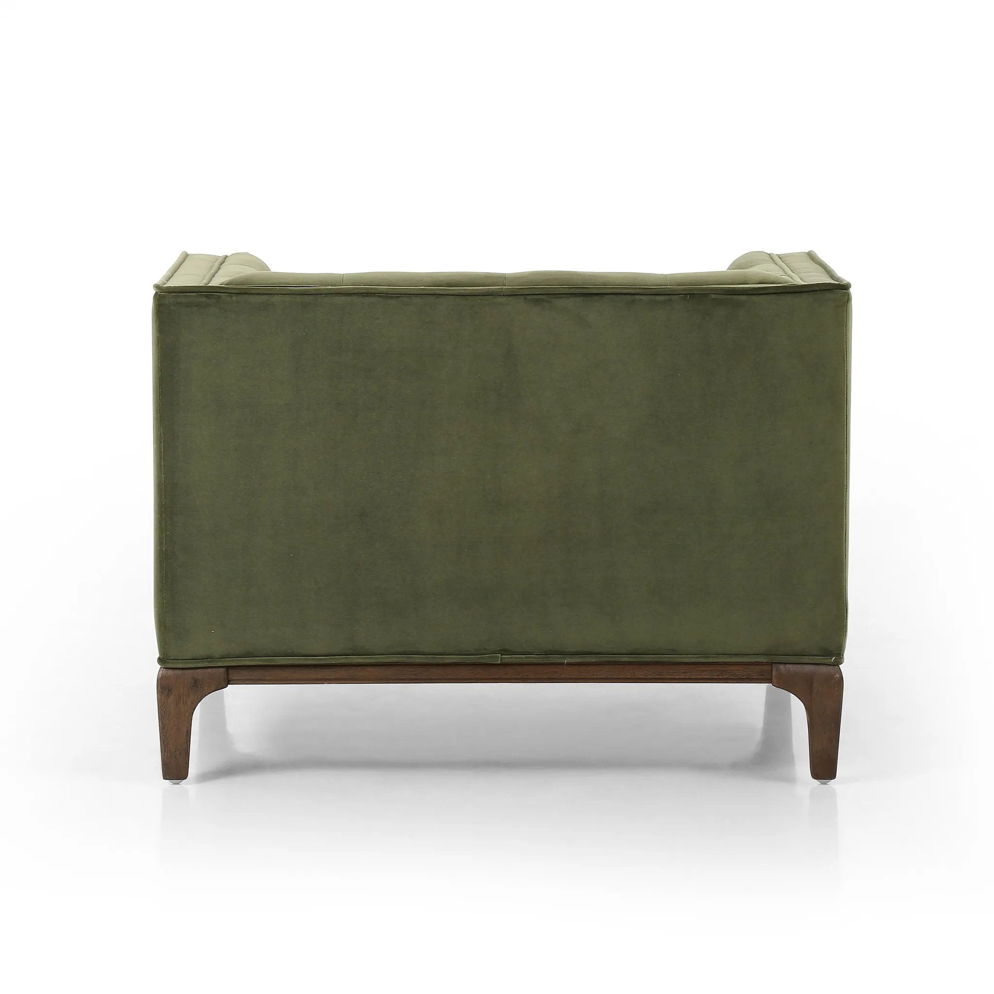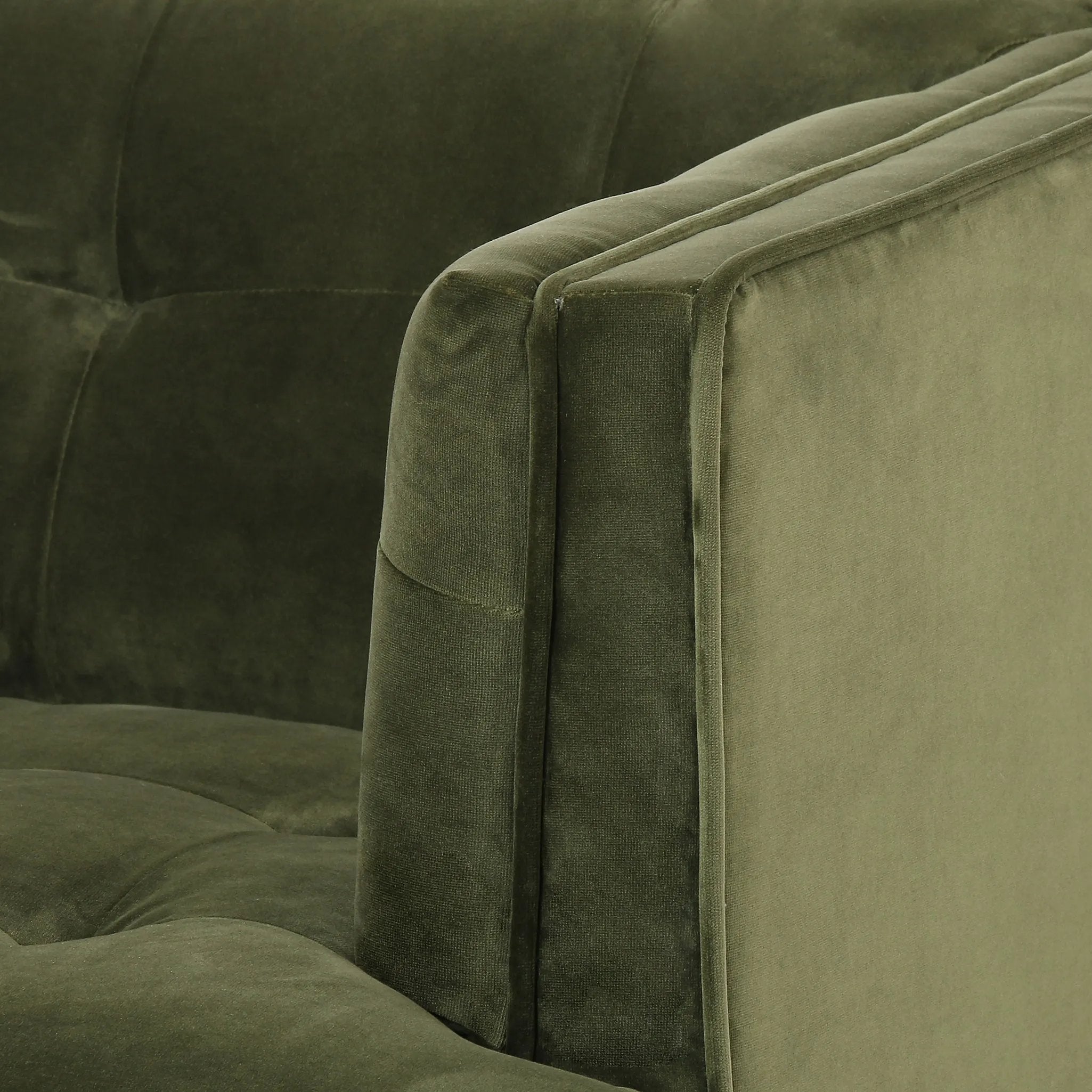 A low, spacious mid-century silhouette is covered in velvety upholstery in an intriguing sapphire olive, with blind tufting.