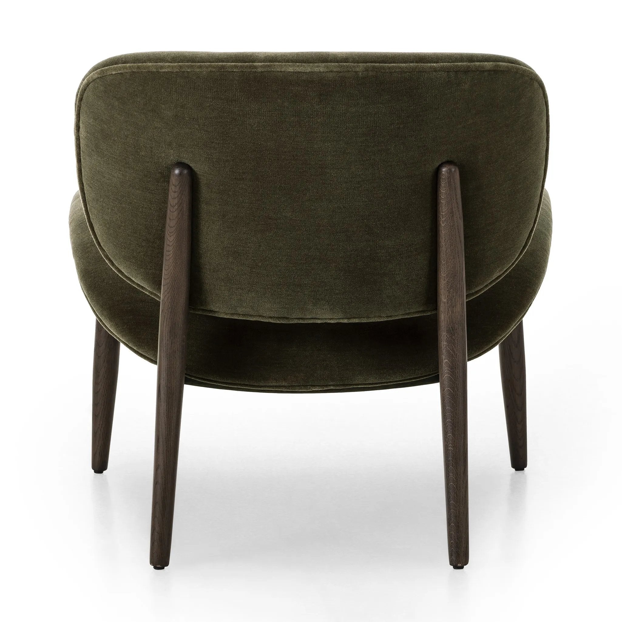This perfect accent chair, designed for unwinding. Upholstered in a velvety olive chenille made from recycled materials, with wide proportions and cozy curves and cushioning. Slim, tapered wooden legs balance the look.