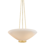 The traditional silhouette of the Awosting pendant receives a fashionable update with jewelry-inspired details. Blown from opal matte glass, the shade’s softened edges evoke a sense of calm, organic beauty. As light passes through the oculus, the lace-like metalwork becomes more noticeable. At the top, a trio of delicate vintage-inspired chains supports the shade. Awosting is available in two sizes and two finishes, Aged Brass and Dark Bronze.