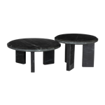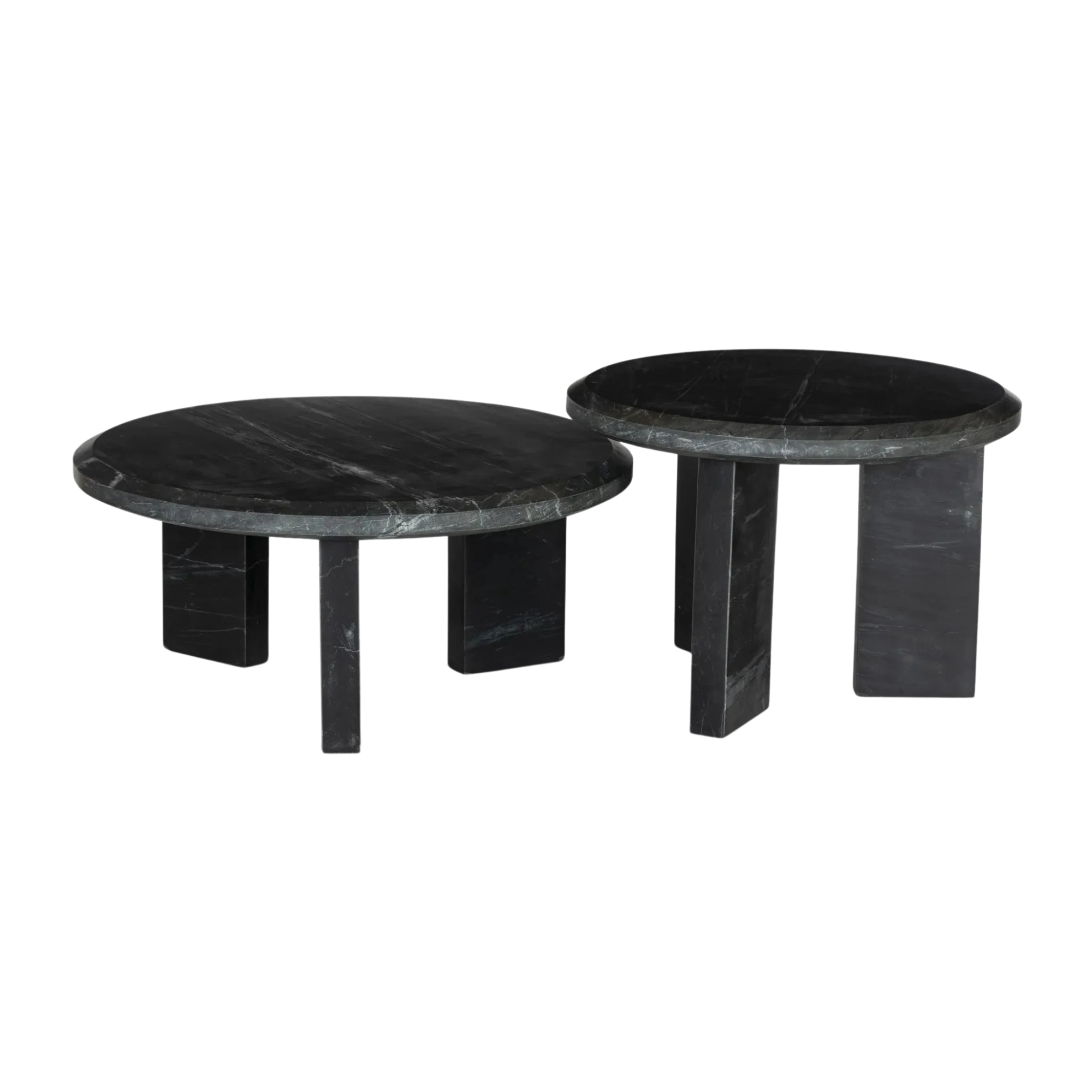 A nesting set of sculpted coffee tables, crafted of black marble with block legs and chamfered edges — perfectly sized for intimate spaces. Natural veining ensures each table is one of a kind, celebrating the natural beauty of marble.