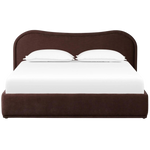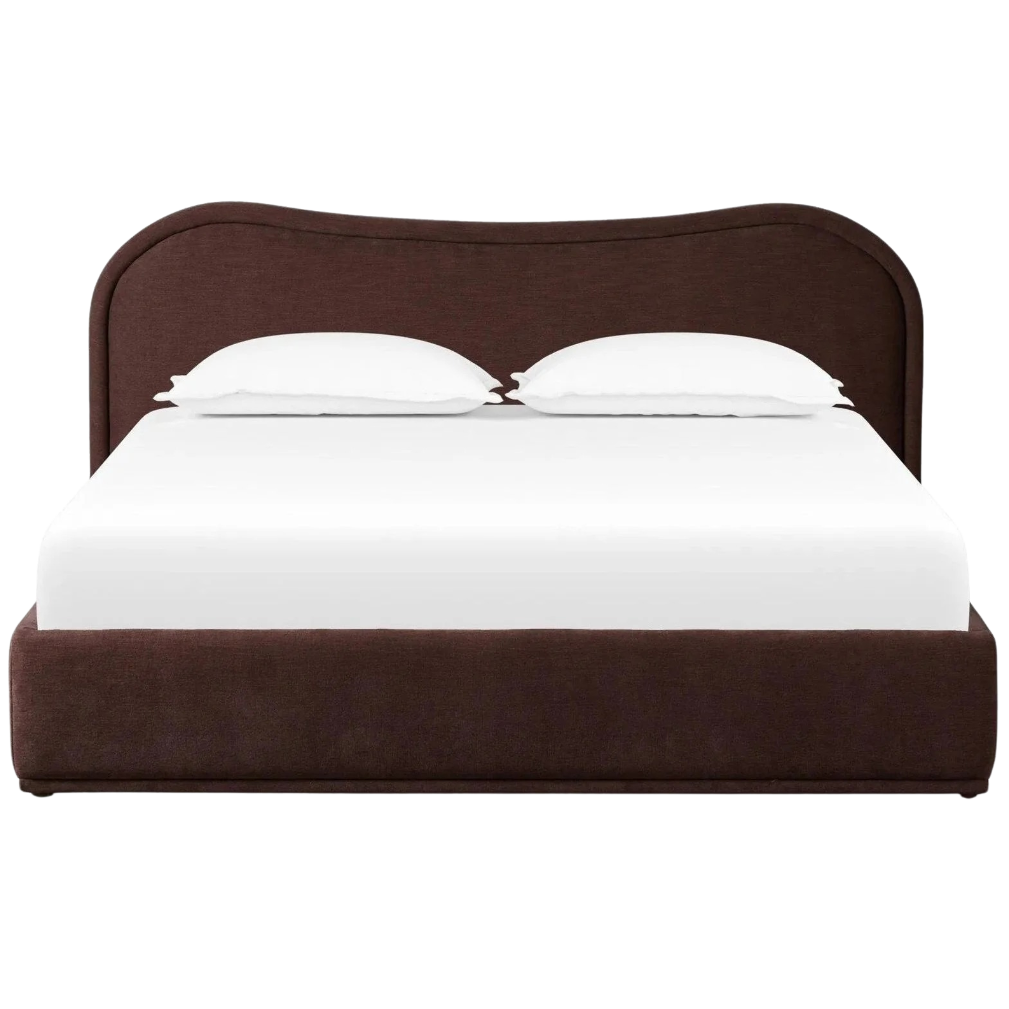 Subtly curved, this swooping bed frame is fully upholstered in a soft, plum-hue fabric for an inviting look that's rich in comfort.