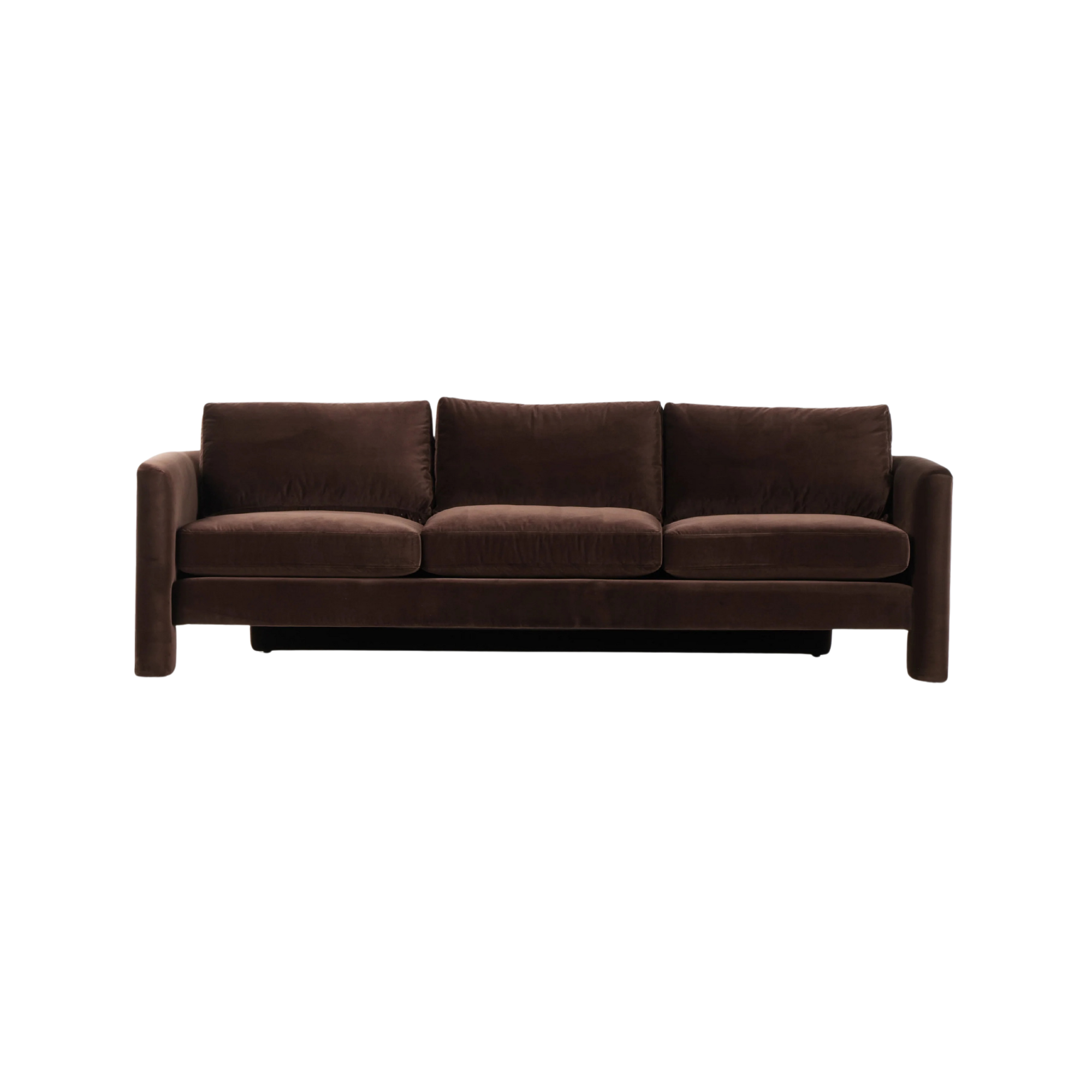 Featuring Katya Surrey Cocoa Sofa by Four Hands at Amethyst Home. Float-style this unique sofa in a room to show off design details like sleek lines and rear cutouts. Designed with S spring construction, foam and fiber seat cushioning and loose feather-blend back cushions. Upholstered in a soft, velvety cotton in a rich chocolate brown.Overall Dimensions: 96.50"W x 39.75"L x 33"H