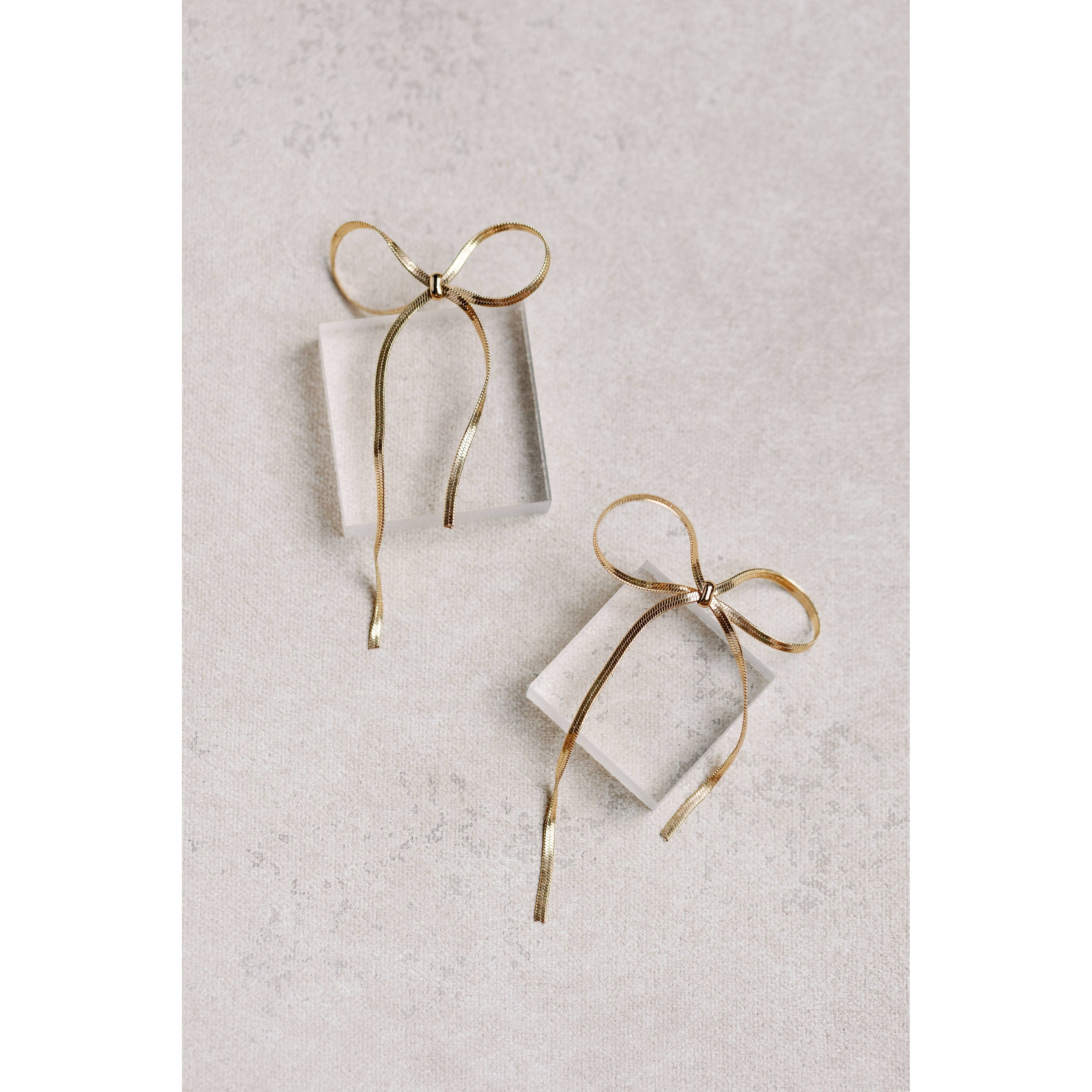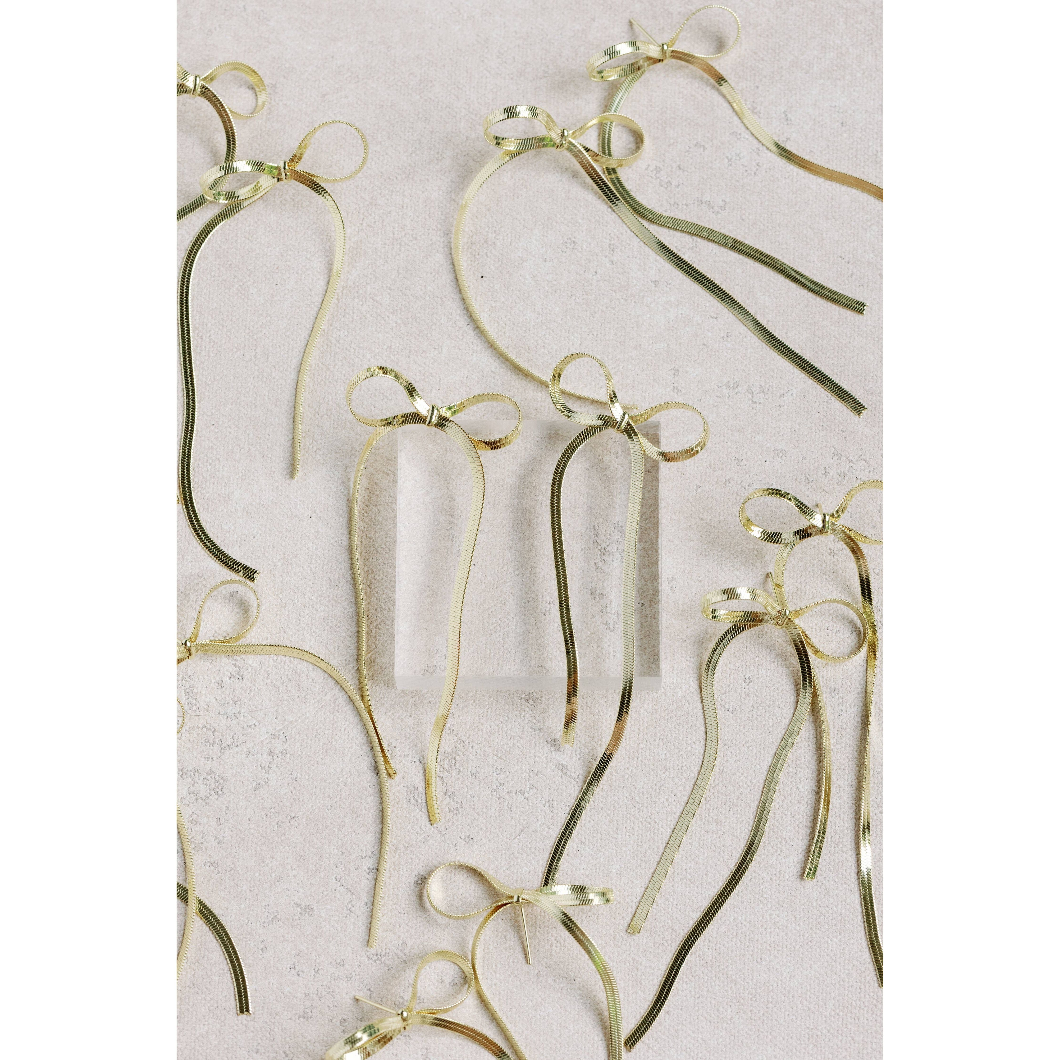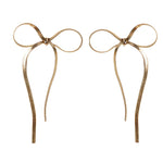 Add a sleek touch of elegance to your holiday ensembles with these stunning minimalist skinny gold bow duster statement earrings, perfect for Christmas and Holiday. These weightless 3.5” earrings feature a delicate gold bow design that gracefully sparkles and sways, making them the perfect festive accessory. These were a top seller for Holiday 2024!
