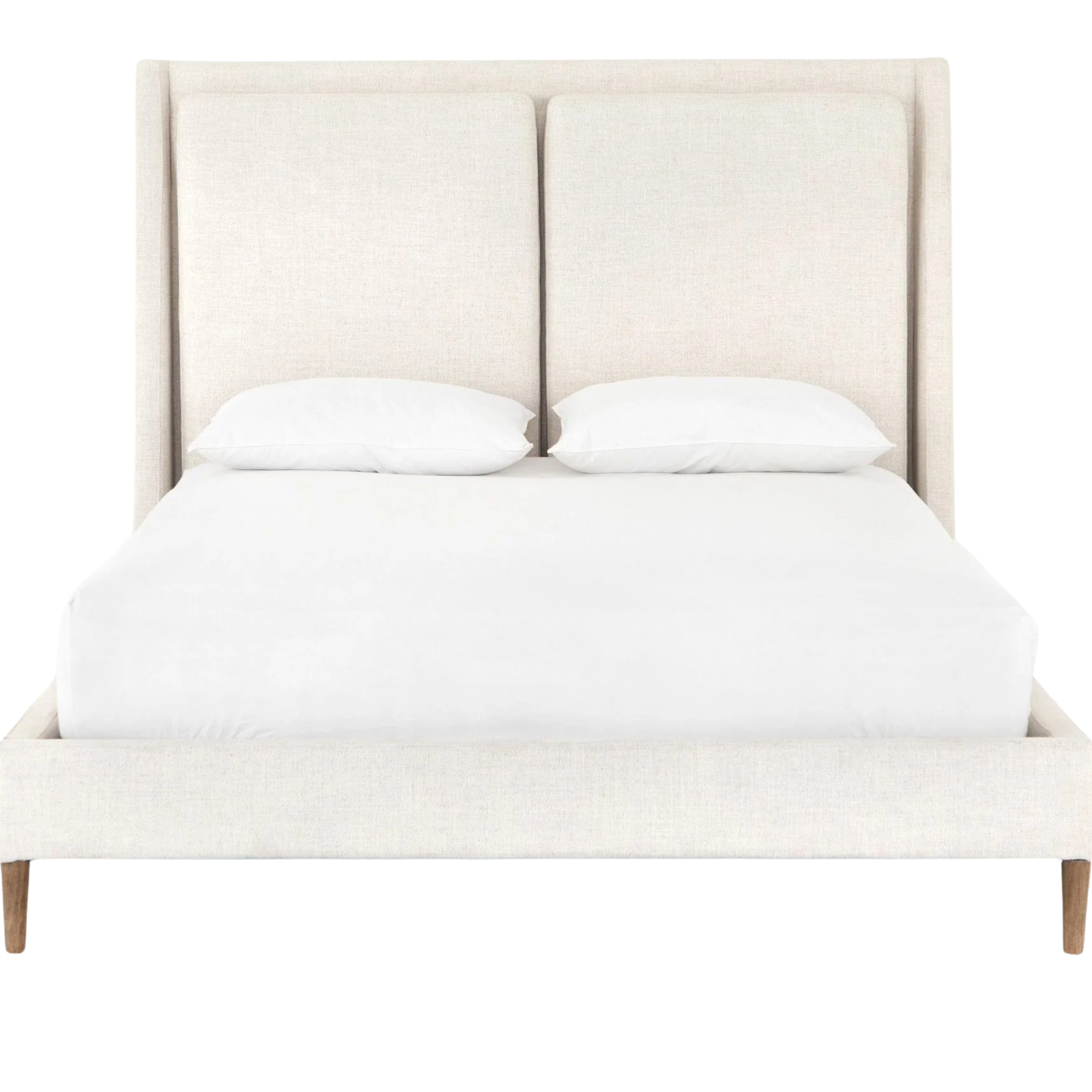 Welcome light, livable luxury into your bedroom with a fully upholstered bed. A tapered headboard features a fixed oversized cushion of high-performance fabric, creating a soft, layered look. Understated wooden legs complete the design. Performance fabrics are specially created to withstand spills, stains, high traffic and wear, ensuring long-term comfort and unmatched durability.