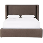 A shorter wingspan and geometric cutouts define this modern-day shelter wingback bed, designed for comfort from every angle. Upholstered in a natural taupe fabric with subtle texture and a soft hand.