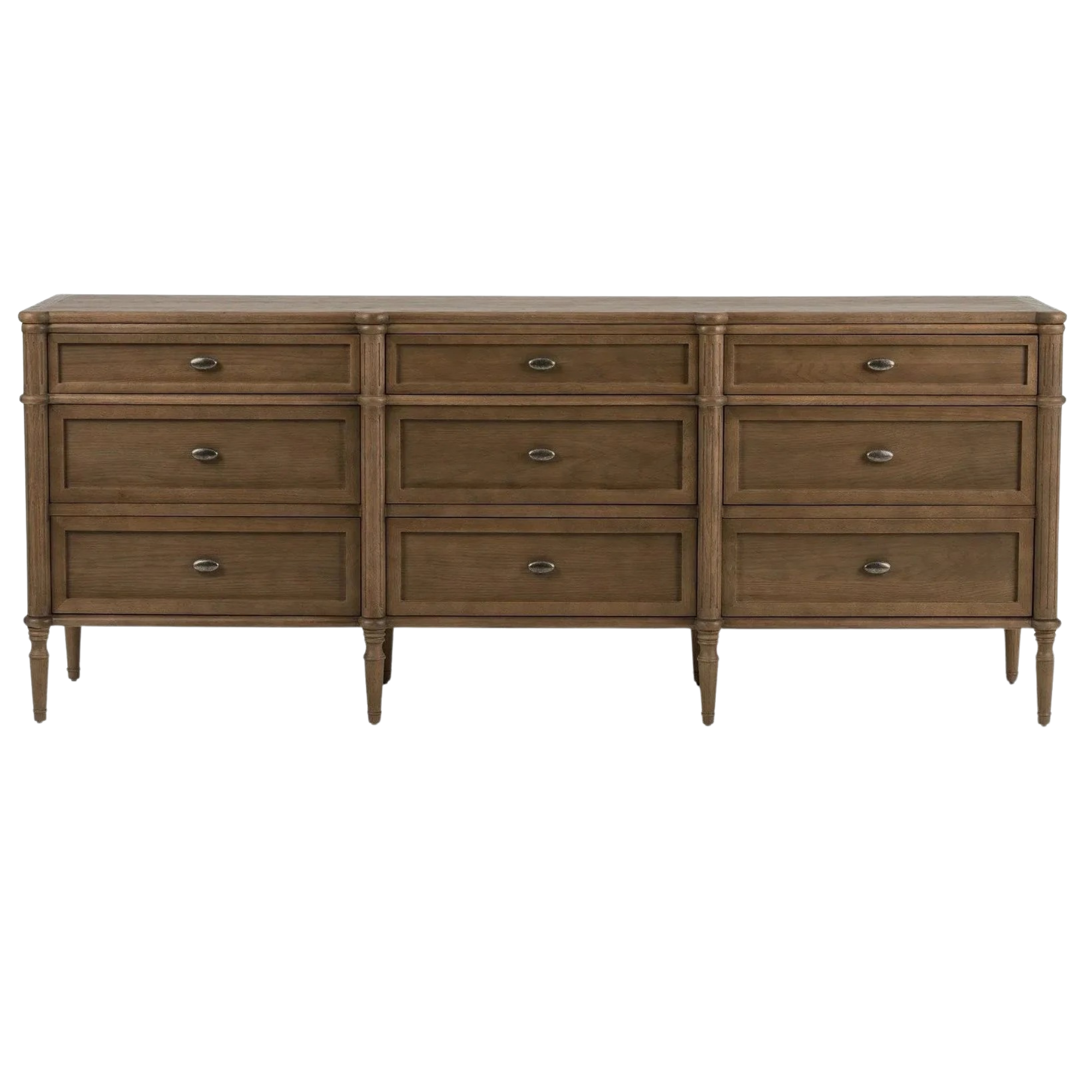 Made from toasted oak with slim legs, nine drawers bring antique European vibes to modern bedroom styling.