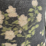 A faded stone washed black background, creme, beige, light grey and green floral accents. This pillow has a soft nubby texture, finished edge and metal zipper closure and binded edge.