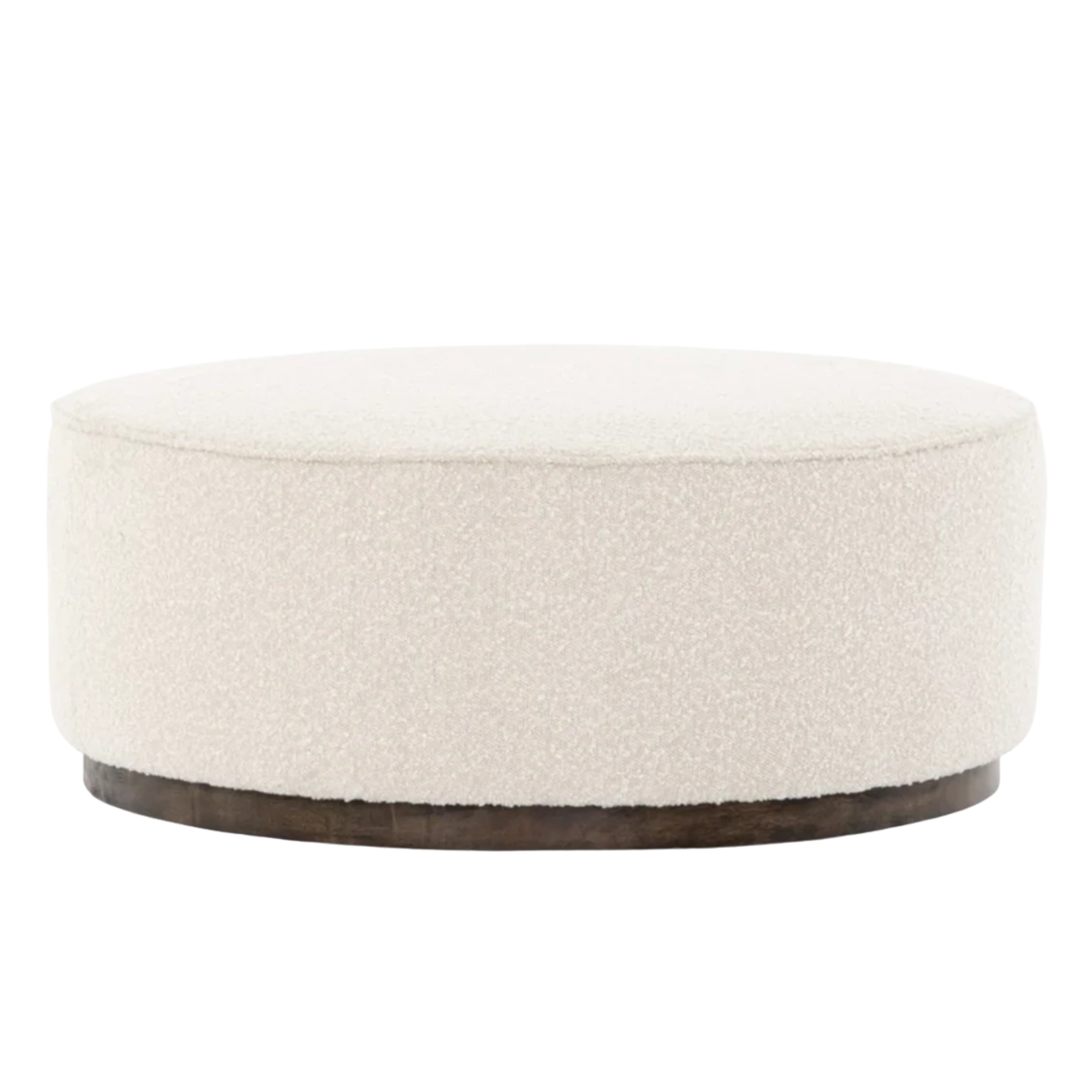 Featuring Sinclair Large Round Ottoman - Knoll Natural by Four Hands at Amethyst Home. This firm round ottoman of textural cream boucle makes a great coffee table or closet bench!