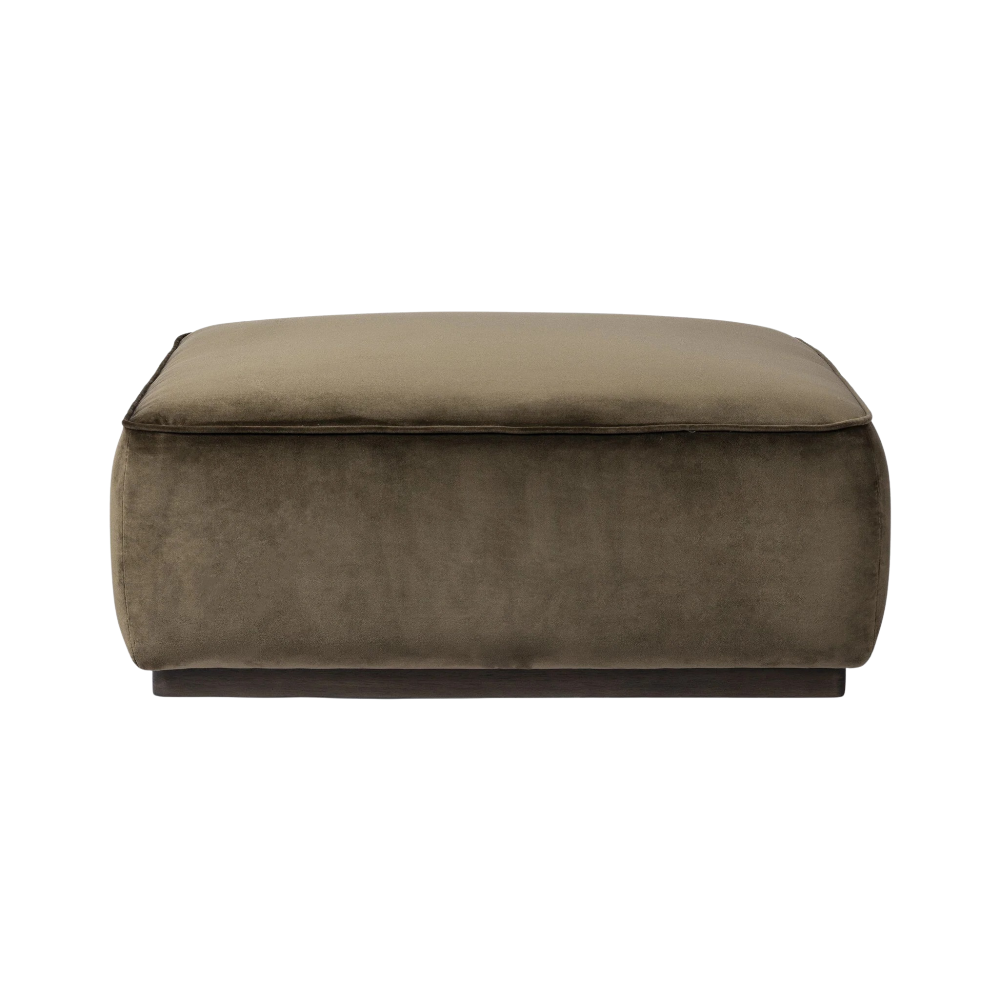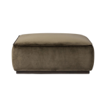 Upholstered in a deep olive velvet paired with a solid brown wood base, this 36" square ottoman can be placed just about anywhere – bringing with it a luxe vibe. Style with a tray as a design-forward coffee table.
