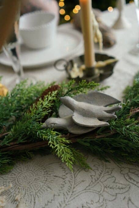 - Petite metal bird figurine with a rustic, weathered finish