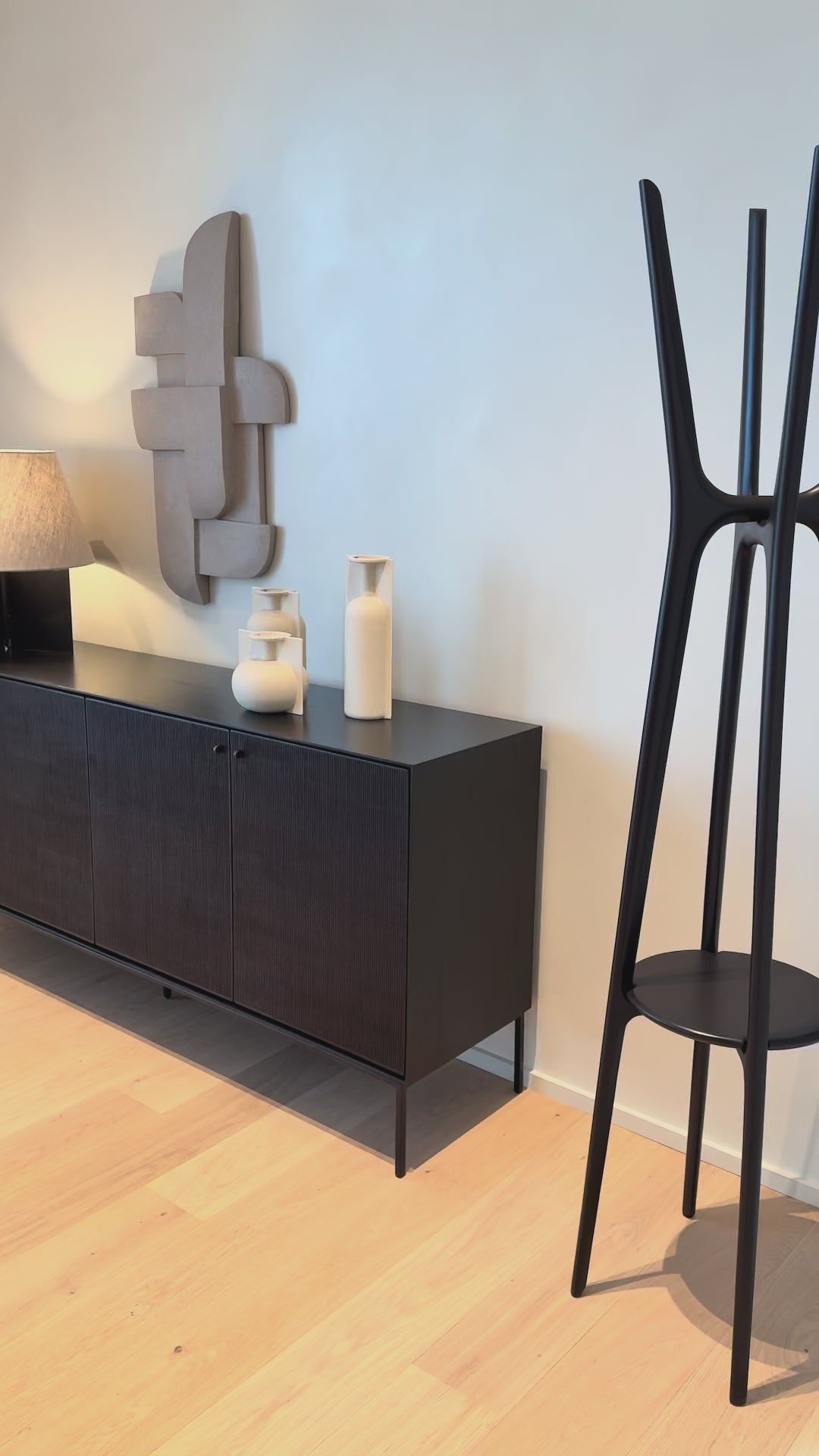 The Grooves sideboard is soulful to say the least. Every single line you see is hand carved, making each piece truly unique. Small imperfections are part of the story, even more so: they enhance Grooves' character. The result is a slightly different surface every time, each with its own rhythm and dynamics. The beautiful dark tinted teak continues on the inside, where shelves will hold your most cherished objects.