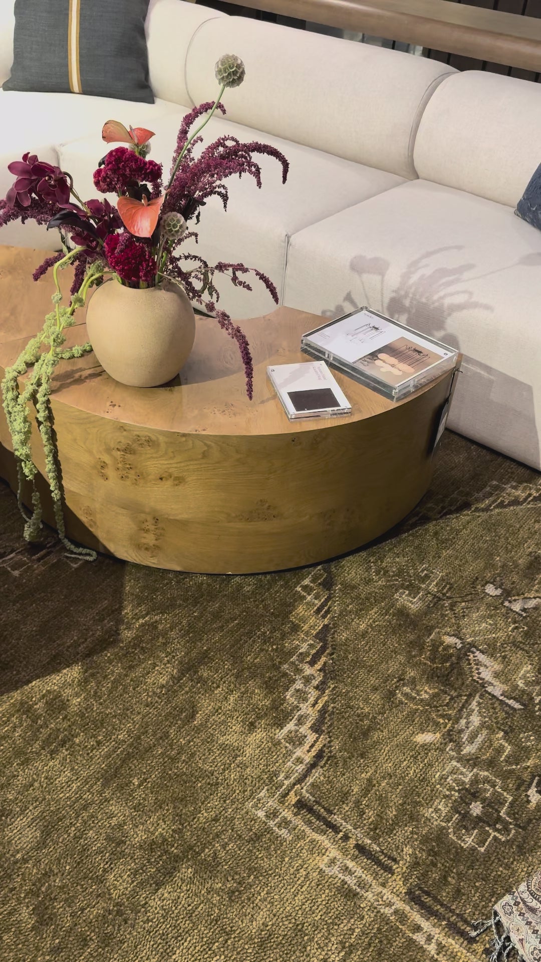 A coffee table that moves with you. Made from oak burl veneer with beautiful movement, this three-piece design pulls apart to create different looks and configurations based on your needs. Pushed together, individual pieces shape a circle; create a wave shape touching just the end pieces together — or, style all three apart.