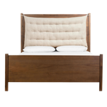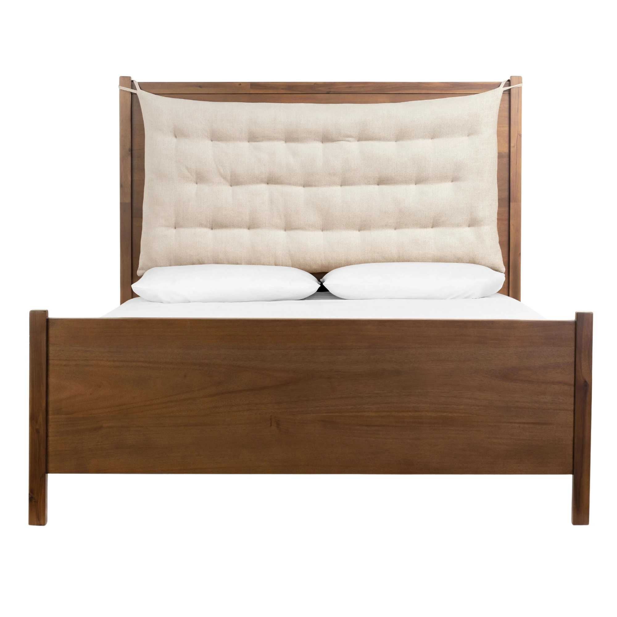 A simple, heavy wood bed frame with a removable sling cushion in a neutral fabric with blind button tufting. Choose the all-wood look or opt for a softer look with the pillow. The cushion is reinforced at the corners for added durability and easily removed for cleaning.